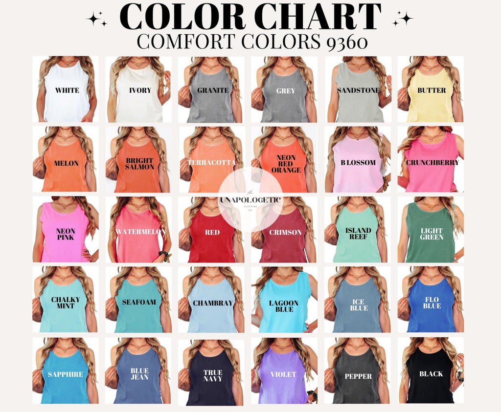 • Comfort Colors as pictured and Tultex/Gildan or comparable is offered as well please refer to color chart listed as Gildan 1800, color variations may occur, but they will be as close as possible.